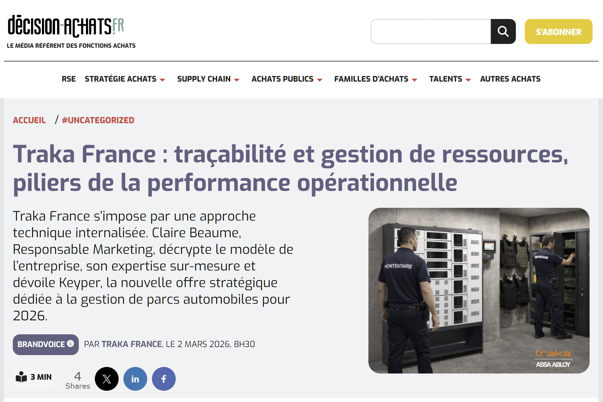 Découvrez l’article publié dans Décision Achats, mettant en avant Traka France, ses forces et son savoir-faire ! Claire Beaume, Responsable Marketing & Communication, décrypte le modèle de l’entreprise, son expertise sur-mesure et dévoile Keyper, la nouvelle offre stratégique dédiée à la gestion de parcs automobiles pour 2026.